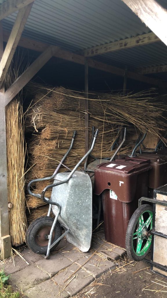 28-09-2025: Voor de winterrustperiode: laatste hand gelegd aan het rietscherm bij pijp 4; de vangpijp is verstevigd; een nieuwe voorraad riet voor de schermen volgend jaar is weer binnen.