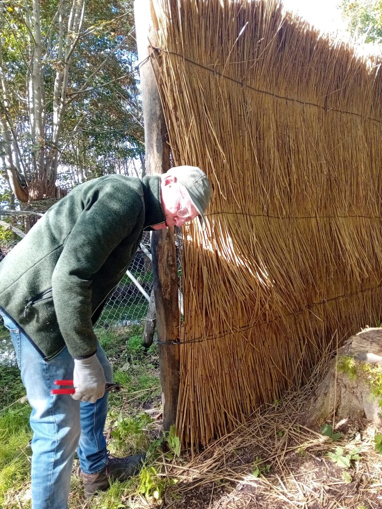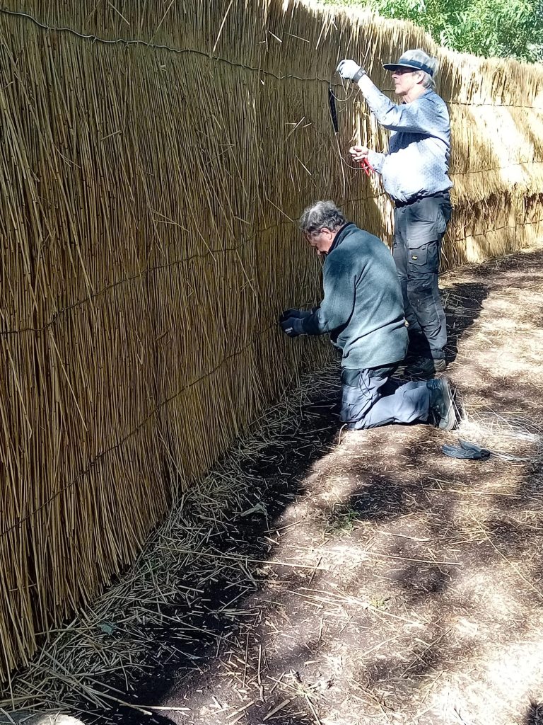 04-04-2023: reparatie van een rietscherm. Het gat wordt opgevuld met riet door het riet eerst van onder en daarna van boven tussen de draden te steken. En zo het gat op te vullen. De bovenkant wordt daarna gelijk gemaakt.
